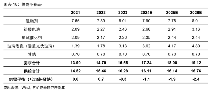 供需关系反转后,预计未来三年呈现紧缺格局。需求侧我们预计, 2026 年合计需求达到 19.12 万吨,从未来几年的消费结构变迁来看,阻燃剂的逐步下降,玻璃陶瓷的占比逐渐抬升到第二大需求来源,其它需求相对稳中有升。我们假设阻燃剂增速为 3.1% ,铅酸蓄电池增速为 8.7% ,聚酯催化剂增速为 4% ,玻璃陶瓷假设增速光伏玻璃澄清剂对锑的需求拉动。整体的锑需求呈现稳步抬升。