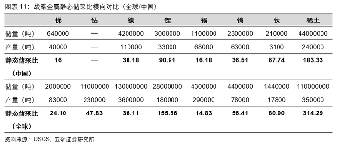 锑在地壳中的平均丰度仅为千万分之二到千万分之五,稀缺度胜过四大战略金属中其它三个品种。按照USGS 2023 年口径,锑矿产量 8.3 万吨,全球储采比仅 24 年(中国仅 16 年)。横向对比全球部分战略矿产如钴、镍、锂、锡、钨、钛与稀土的静态储采比,资源极度稀缺是锑最显著的特点之一。