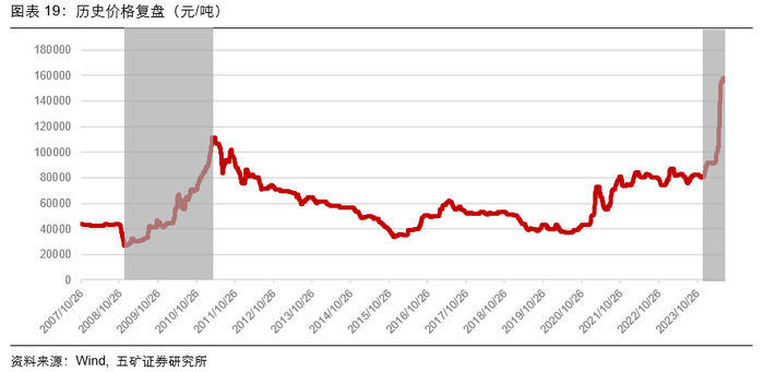 库存消化+供给扰动叠加,资源端的紧缺,进一步放大了需求拉动的效应,24 年开年后锑价步入历史新高。 2024H1 锑价驱动,来自 23 年库存消化后的低库存与供给端多扰动叠加:地缘政治冲突以及英美对俄罗斯金属的制裁使得俄罗斯等外矿的锑矿进入国内不畅,加上之前国内有几个矿场发生事故,5 月环保督察组进驻湖南等导致短期国内锑原料供应紧张。