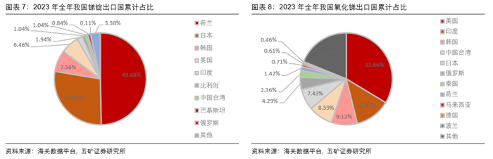 中国同时是世界上最大的锑出口国,主要出口到美国、荷兰、日本等国,以出口锑锭、氧化锑为主。 2023 年中国分别出口到荷兰、日本、韩国和美国的锑锭出口量为2414.88吨、1358.68吨、367.51吨和313.86吨,占总出口量的比重分别为49.68%、27.95%、7.56%和 6.46% ;出口到美国、印度、韩国、中国台湾和日本的氧化锑出口量为 11089.15吨、4109.01吨、3003.60吨、2831.01吨和2446.52吨,占比为33.66%、12.47%、9.12%、8.59%、7.43%。