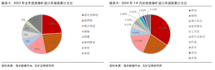 分地区看,泰国、缅甸锑矿进口新增明显。2024年1-6月累计,俄罗斯继续无进口,澳大利亚进口3786吨、玻利维亚进口1414吨、土耳其935 吨、塔吉克斯坦696吨、阿曼613吨;泰国、缅甸进口大幅上升,分别为 7560 吨和 4771 吨,泰国去年无进口,缅甸同比增加 4090 吨。