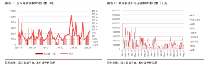 24 年以来,我国进口锑矿呈现上升趋势。2024 年 6 月我国进口锑矿3100 吨,同比下降 16.21% ,2024 年1~6 月,我国累计进口锑矿 21891 吨,同比上升 3.53% ,从进口单价看, 5 月进口均价为 20622 美元/吨,同比上升 387% 。