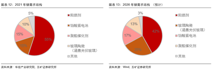 锑需求结构中八成以上锑化合物都作为添加剂参与其中。根据华经产业研究院 21 年口径,锑的下游应用中阻燃剂占比55% ,铅酸电池占比15% ,聚酯催化占比15%,玻璃陶瓷占比10%,其它合计5%。其中阻燃、铅酸、聚酯催化、玻璃陶瓷,锑都是以化合物形式(如氧化锑、焦锑酸钠)添加其中。