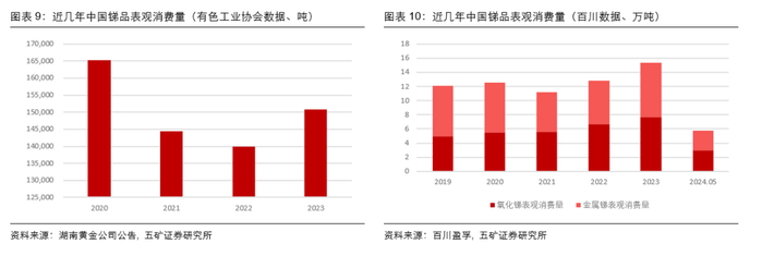 过去五年,我国锑品表观消费量落在 13~15 万吨/年区间。根据百川盈孚口径,2023 年中国锑品表观消费量达 15.31 万吨。自 2019 年中国锑品表观消费量呈现平稳增长趋势, 2019~2023 年表观消费量分别为12.0 /12.54 / 11.24 /12.84/15.31万吨,同比增长为3.70%/-10.35%/14.23%/19.26%,20年疫情扰动外,总体呈现增长状态。根据湖南黄金公告,2023年中国锑品表观消费量为 15.07 万吨。23 年数据口径和百川盈孚统计数据几乎一样,但其余年份数据则略有差距,2020~2023年表观消费量分别为 16.52/14.44/13.99/15.07 万吨,同比增长为 -12.60%/-3.11%/7.75% 。