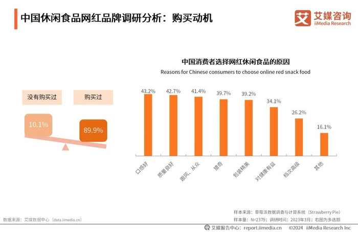 iiMedia Research(艾媒咨询)数据显示,89.9%的消费者购买过网红休闲食品,其中口感好(43.2%)是中国休闲食品消费者选择购买网红休闲食品最重要的原因,质量良好(42.7%)和跟风、从众(41.4%)同样也是消费者购买网红休闲食品的重要影响因素。艾媒咨询分析师认为,网红产品擅长打造具有趣味性、分享性和话题性的营销活动,吸引消费者猎奇尝新。休闲食品的销量取决于消费者对于该产品的质量与口感方面的认可,品牌要提升消费者粘性,仍需要在产品质量上下功夫。