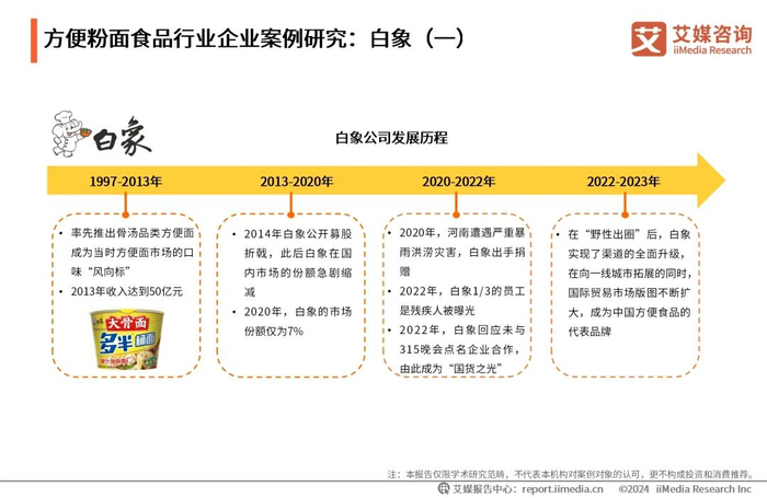 白象食品股份有限公司正式创建于1997年,到2003年率先破局,推出“一元骨汤面”,开创骨汤方便面新品类。目前,白象食品已在河北、山东、四川等10个省布局12个优质面制品生产基地,旗下设有分子公司20余家。自成立以来,白象一直积极投身各项社会公益事业,累计投入数千万元公益资金,推动网络“野性消费”,被誉为“国货之光”。