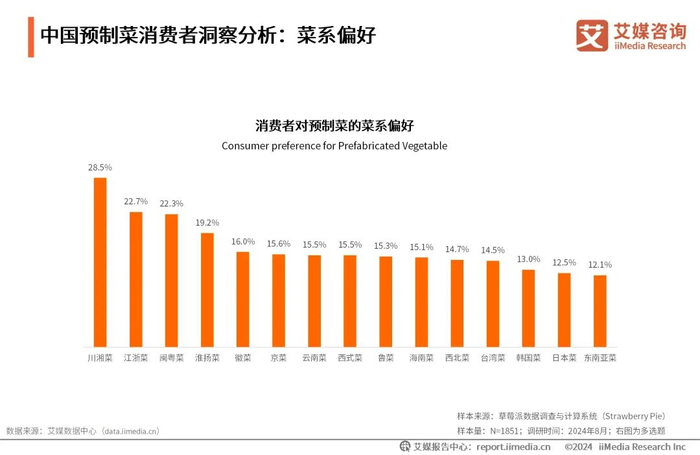iiMedia Research(艾媒咨询)数据显示,在预制菜的菜系品类中,川湘菜最受欢迎,28.5%的消费者喜欢购买川湘菜,其次是江浙菜和闽粤菜。艾媒咨询分析师认为,大多数消费者对预制菜的接受程度高,更偏好于川湘菜的品类,预制菜的制作可以融于传统经典菜系进行创新。