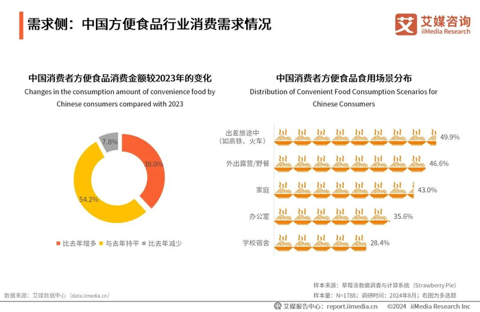 方便食品购买场景不断扩宽,露营热催生方便食品消费新场景。iiMedia Research(艾媒咨询)调研数据显示,2024年中国约四成消费者的方便食品消费金额较去年增多,除了出差旅途、办公室、家庭等场景之外,外出露营/野餐(46.6%)场景逐渐流行。