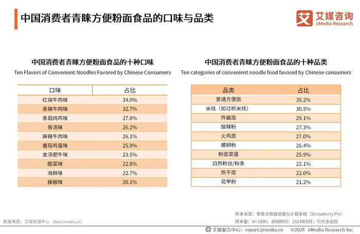 iiMedia Research(艾媒咨询)数据显示,中国消费者更偏好的方便粉面口味是红烧牛肉(34.0%);除普通方便面外,消费者对米线(30.5%)和炸酱面(29.1%)等新细分品类青睐有加。艾媒咨询分析师认为,消费升级及懒人经济推动了方便粉面行业的革新,人们已不再满足于传统的方便面,中高端方便食品逐渐兴起,推动新品类、新口味快速孵化。