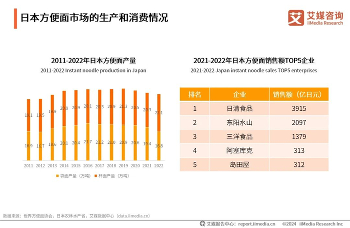 日本方便面主要分为“袋面”和“杯面”。“袋面”是所谓的方便面,是一种在锅里煮沸并添加调味料食用的面条。杯面是一种放在容器中的面条,并按原样用热水食用。艾媒咨询监测数据显示,2022年日本方便面市场规模0.8万亿日元,增长率为-0.2%,行业利润率约3.6%,员工平均年薪606万日元。2022年日本方便面产量为389759吨,同比下降1.8%;袋面产量为168224吨,下降13.3%;杯面产量为221515吨,同比增长9.1%。