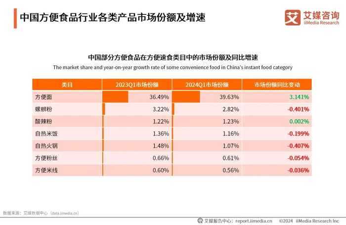 数据显示,方便面在方便速食市场中所占份额最大,2024年一季度占据市场份额达39.63%,较2023年同期有超3个百分点的提升;螺蛳粉产品的市场份额次之,2023年一季度与2024年一季度市场份额在3%左右浮动,同比有所下跌。此外,自热火锅和自热米饭等产品的市场份额均有小幅下跌。