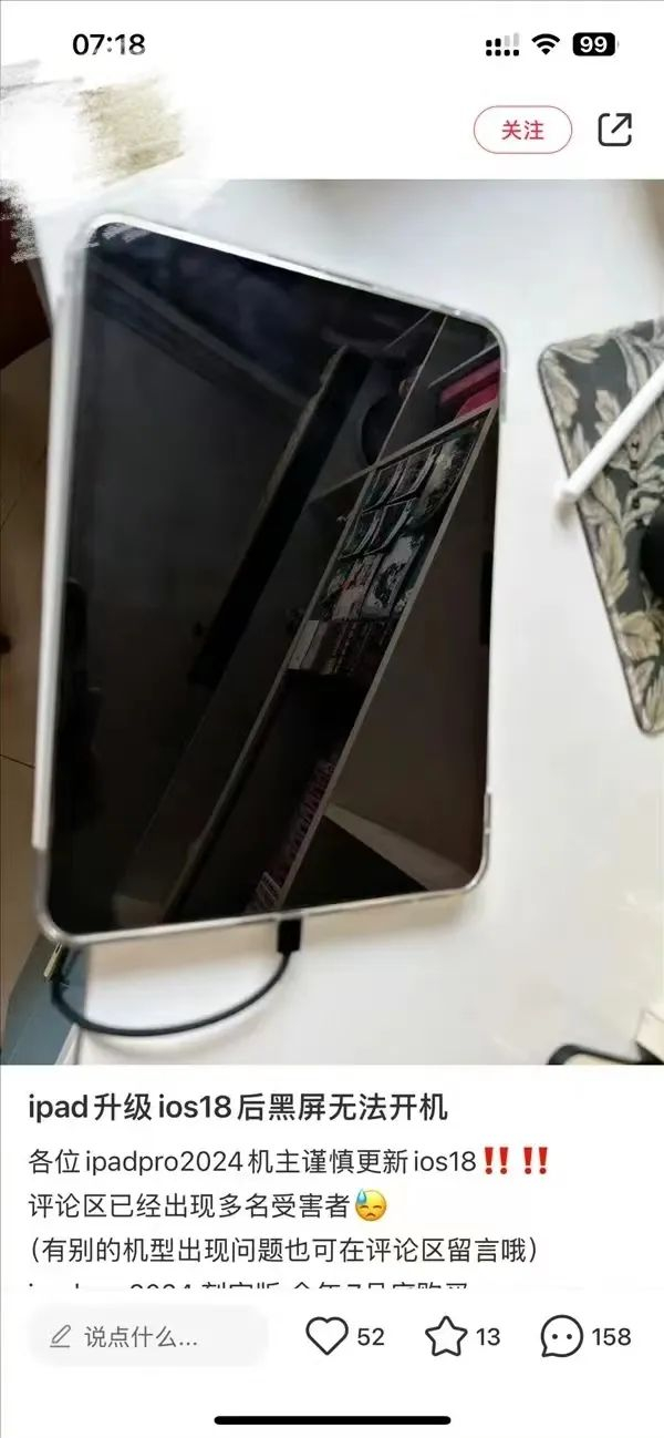 还有网友在社交平台发文,iPadiOS18在更新之后出现黑屏死机,尤其是M4版iPad Pro升级iPadiOS18之后有黑屏无反应无法开机的情况。