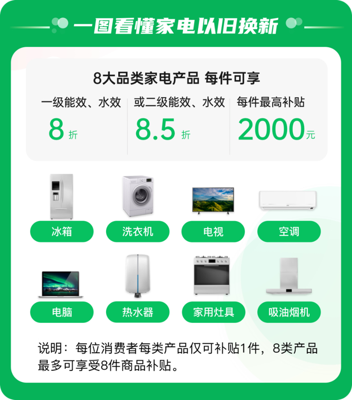 • 每位消费者在全国范围内每类产品可补贴1件,每件补贴不超过2000元,单人最高补贴16000元