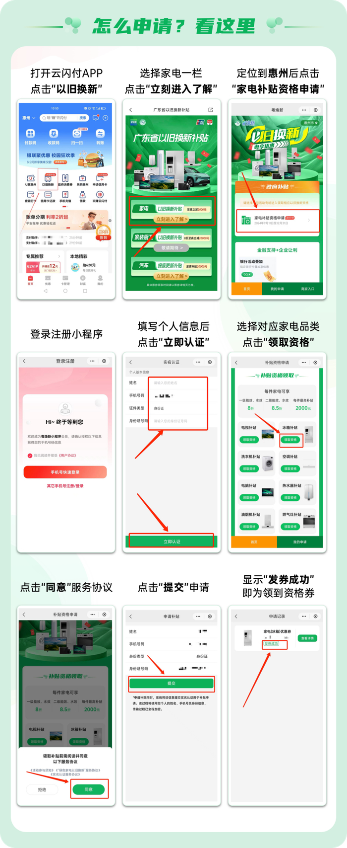 ☑ 申请入口:在云闪付、微信、支付宝等APP进入“广东粤焕新以旧换新公共服务平台”申领活动范围家电品类补贴资格券。