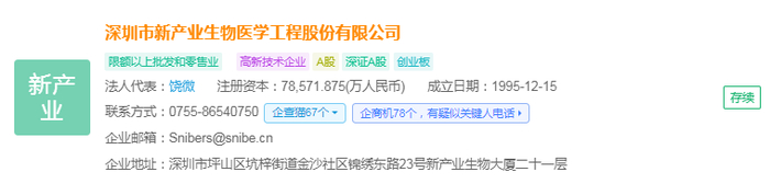 企查猫资料显示,深圳市新产业生物医学工程股份有限公司(简称:新产业)成立于1995 年,注册资金为78,571.875(万人民币),公司位于深圳市坪山区。该公司是一家专业从事体外诊断产品研发、生产、销售及服务的国家级高新技术企业。自成立以来,新产业一直专注于化学发光免疫分析领域的研究,并于2008年9月成功完成中国第一台全自动化学发光仪的注册并推向市场。截至目前,新产业已研发推出超过156款配套试剂,中国内地市场已取得化学发光检测试剂注册证217项,处于行业领先地位。