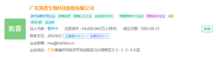 广东凯普生物科技股份有限公司(简称:凯普生物)成立于2003-06-13,位于广东省潮州市,法人代表是管乔中,注册资金为64,650.066(万人民币),该公司是中国HPV-DNA检测试剂的领军企业,专注于分子诊断试剂、分子诊断配套仪器等核酸诊断相关产品的研发、生产和销售,并提供相关服务。其主要产品包括第三方医学实验室检验服务以及核酸检测试剂和仪器。凯普生物拥有多项国内外专利,在基因研究和相关领域中处于世界领先地位。
