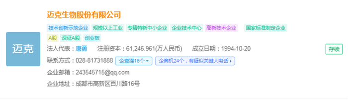 迈克生物股份有限公司(简称:迈克生物)成立于1994年,注册资金为61,246.961(万人民币),法人代表是唐勇,总部设立于成都市高新区。该公司拥有体外诊断设备、试剂、校准、质量控制等专业技术,并在生化、免疫、POCT、凝血、输血、血球、尿液、分子诊断、病理等技术领域推出产品。迈克生物被誉为国产“化学发光五虎”之一,并拥有9大产品线,是目前布局最丰富的IVD企业之一。