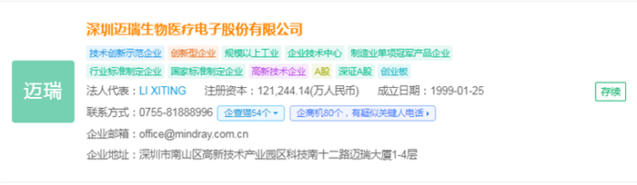 根据企查猫资料,深圳迈瑞生物医疗电子股份有限公司(简称:迈瑞医疗)成立于1999年,注册资金为121,244.14(万人民币)。主要业务包括医疗器械的研发、制造、营销及服务,产品覆盖生命信息与支持、临床检验及试剂、数字超声、放射影像四大领域。公司总部位于深圳市南山区高新技术产业园。截至2024年3月,迈瑞在北美、欧洲、亚洲、非洲、拉美等地区设有约40个国家的62家境外子公司和30余家分支机构,并建立了十大研发中心。