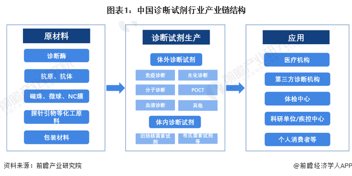 据前瞻产业研究院整理资料,诊断试剂行业上游主要为医药化工原料(包括酶制剂、抗原、抗体、精细化学品等)和医用包装材料,中游为诊断试剂研发生产企业,下游为医疗机构、第三方诊断机构等应用市场。