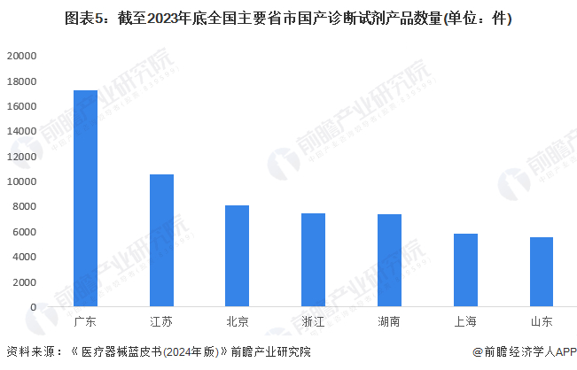 《医疗器械蓝皮书(2024年版)》数据显示,截至2023年底,广东省国产诊断试剂产品数量超过1.7万件,较第二名江苏的诊断试剂产品数量多7000余件。