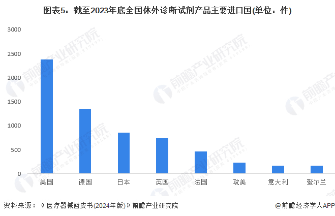 截至2023年底,中国进口体外诊断试剂产品总计6961件,其中来自美国的产品达到2381件,来自德国的产品达到1351件,来自日本和英国的产品分别达到855件和742件。