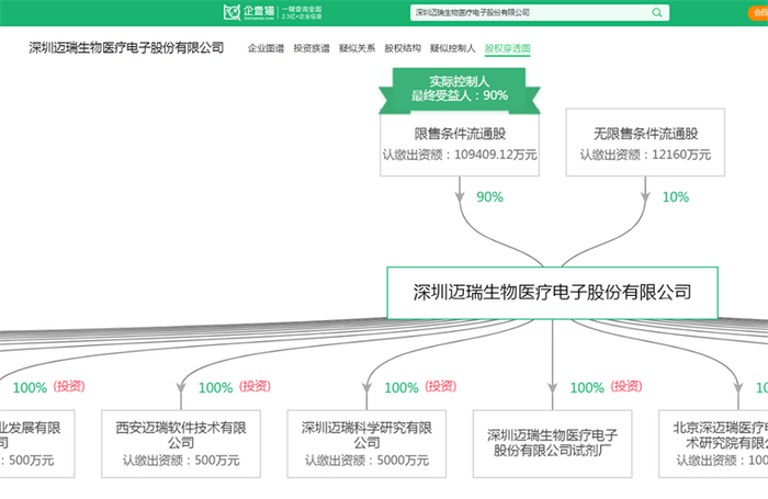 企查猫股权穿透图显示,迈瑞医疗公司旗下拥有17家子公司:分别是杭州迈瑞医疗电子有限公司、武汉迈瑞生物医疗科技有限公司、深圳迈瑞科学研究有限公司、砀山迈瑞医疗科技产业发展有限公司等,分布在杭州、武汉、深圳等地。