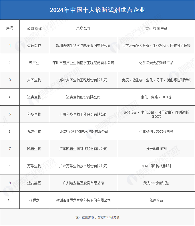 根据前瞻产业研究院报告《2024-2029年中国诊断试剂行业市场前瞻与投资战略规划分析报告》整理得出,2024年中国十大诊断试剂企业汇总如下(注:排名不分先后):