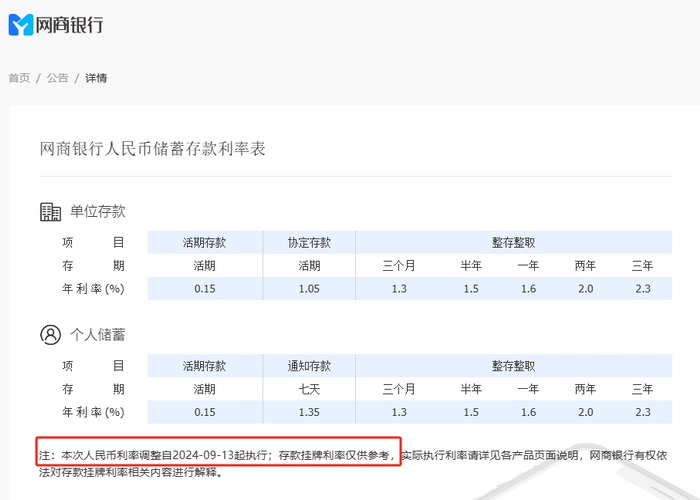 据网商银行官网公告显示,该行于2024年9月13日起执行新的人民币储蓄存款利率表。其中,三年期定期存款(整存整取)年利率已降至2.3%,两年期定期存款(整存整取)年利率已降至2.0%。