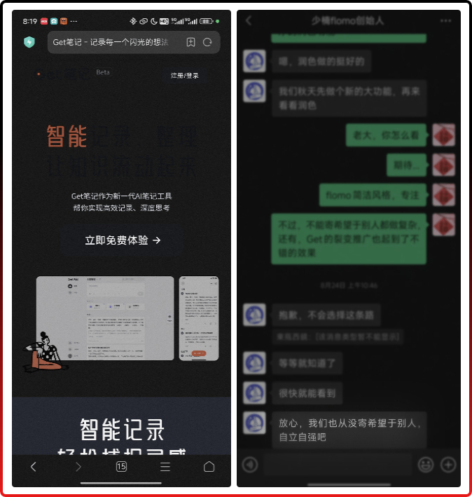 我记得似乎是去年罗胖的跨年演讲还致敬了flomo,少楠还发了朋友圈互敬得到,一转眼,两个好友将不得不争夺同一批用户。