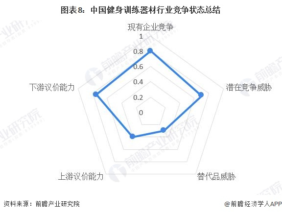 从五力竞争模型角度分析,目前,我国训练健身器材行业保持平稳增速,但行业入局门槛较低,潜在进入者威胁较高;替代品方面,其他行业产品对健身训练器材行业威胁目前较低,行业现有产品较为成熟全面;上游钢铁、橡胶等原材料产能充足甚至过剩,议价能力较弱;现有企业竞争方面,行业高端市场中国外品牌优势明显竞争相对平缓,中低端市场产品同质化现象较为严重,竞争十分激烈,因此下游消费者议价能力业相对较强。总体而言,行业竞争较为激烈,随着国内行业头部企业持续创新、整合供应链优势,未来行业集中度将逐步增加。