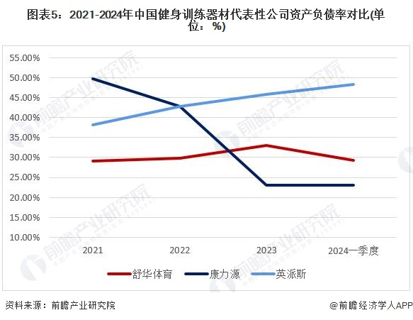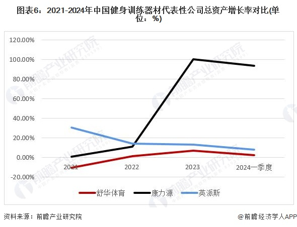企业发展方面,江苏康力源体育科技股份有限公司的总资产增长率在2023年及2024年一季度较高,分别为100.45%和93.76%,舒华体育股份有限公司的总资产增长率在2021年为负值,减少10.2%,表明企业资本受到侵蚀,随后在2022至2024年一季度扭转并始终保持正增长,青岛英派斯健康科技股份有限公司的总资产增长率在相应期间内始终保持为正,但数值持续下跌。