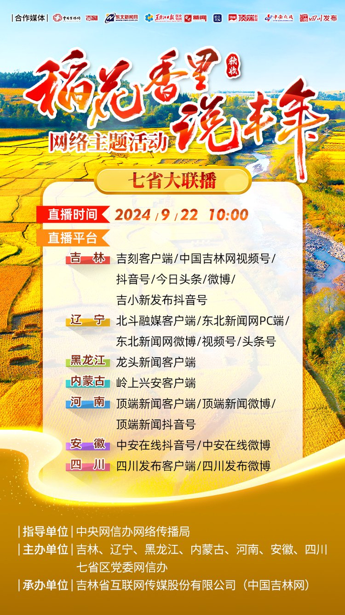 中国吉林网、东北新闻网、黑龙江日报·龙头新闻、内蒙古兴安盟融媒体中心、顶端新闻、中安在线、四川发布等全国七省区联动媒体将强强联手,同频互动,同庆丰年,共晒“中国饭碗”。