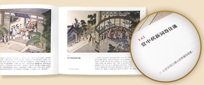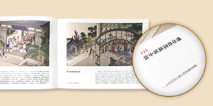 比如用了十三幅图展现“贾政携宝玉和众客游览大观园”,跟着画面而走,能看到沁芳桥、潇湘馆、稻香村、蘅芜苑、蜂腰桥等大观园景观。贴近书本,仿佛置身其中,亲览大观园。