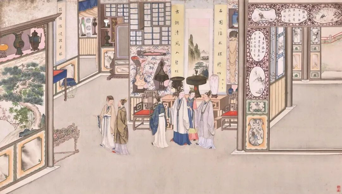 感受下这屋内摆设,遑论字画、花瓶、香炉,就连丫鬟们的发饰、耳饰也清晰可见↓