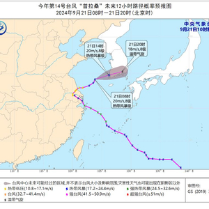 大风预报:9月21日14时至22日14时,受“普拉桑”和冷空气的共同影响,渤海、渤海海峡、黄海、东海大部、台湾海峡、辽东半岛沿海、河北沿海、天津沿海、山东半岛沿海、江苏沿海、长江口区、杭州湾、上海沿海、浙江沿海、福建沿海、广东东部沿海将有6-7级大风,阵风8-9级,其中黄海东南部、东海西部的部分海域风力有8级,阵风9-10级。