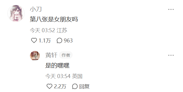 当网友问“第八张是女朋友吗?”黄轩回复:“是的嘿嘿”。