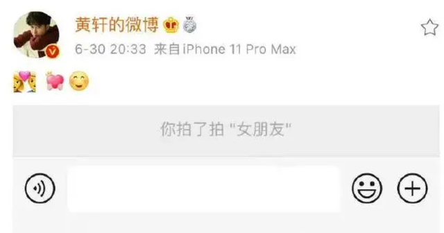 当晚,他在微博晒出“你拍了拍'女朋友'”的截图大方认爱。随后,黄轩通过工作人员表示,女方是圈外人,希望不要打扰到她。
