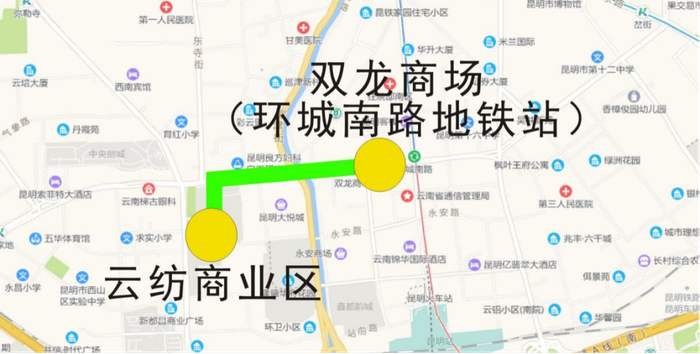 途经道路:雨龙路、关景路、民航路、环城南路、拓东路