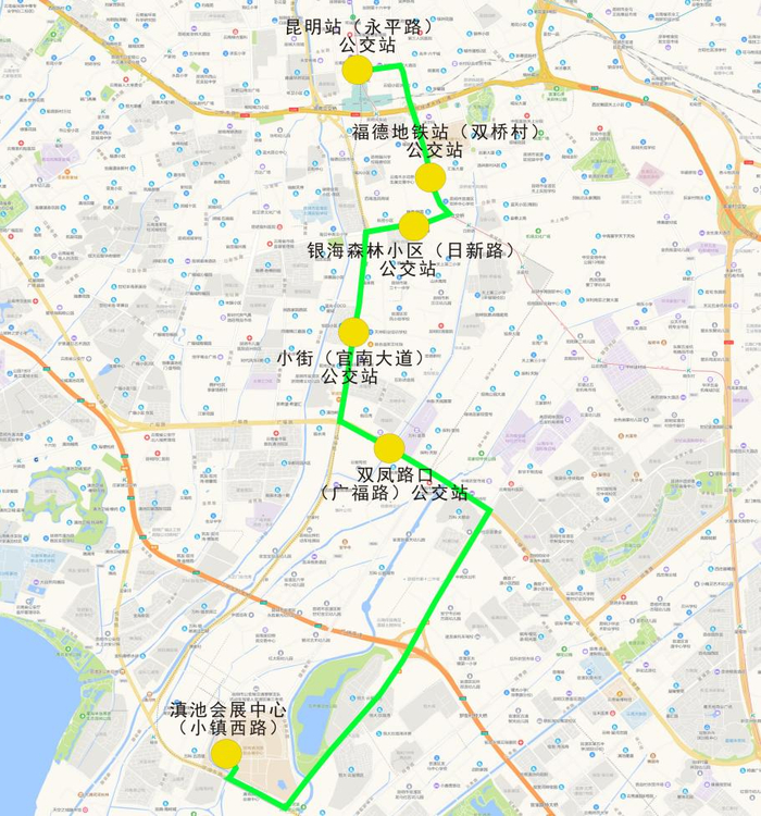 途经站点:滇池会展中心(小镇西路)(起始站)→双凤路口(广福路)→小街(官南大道)→银海森林小区(日新路)→福德地铁站(双桥村)→昆明站(永平路)(终到站)