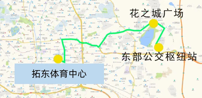 起终站:东部公交枢纽站(起始站)花之城广场(途经站)→拓东体育中心(终到站)