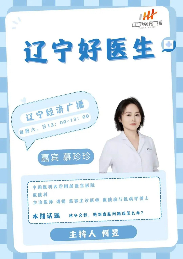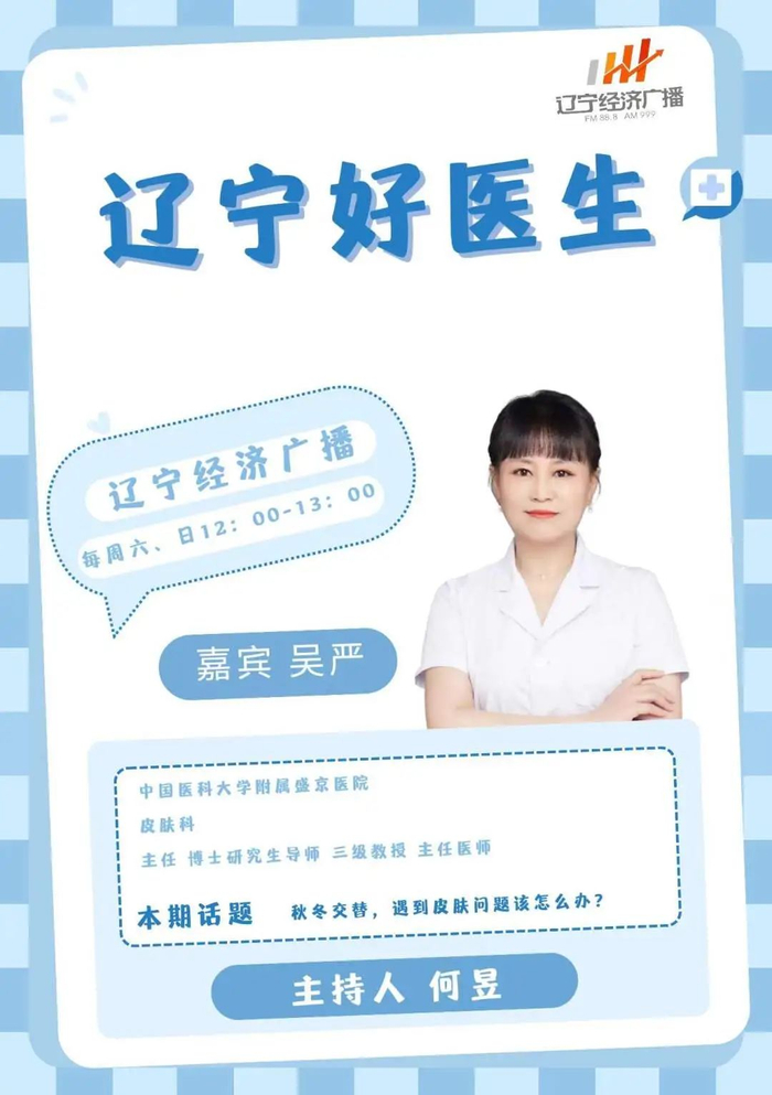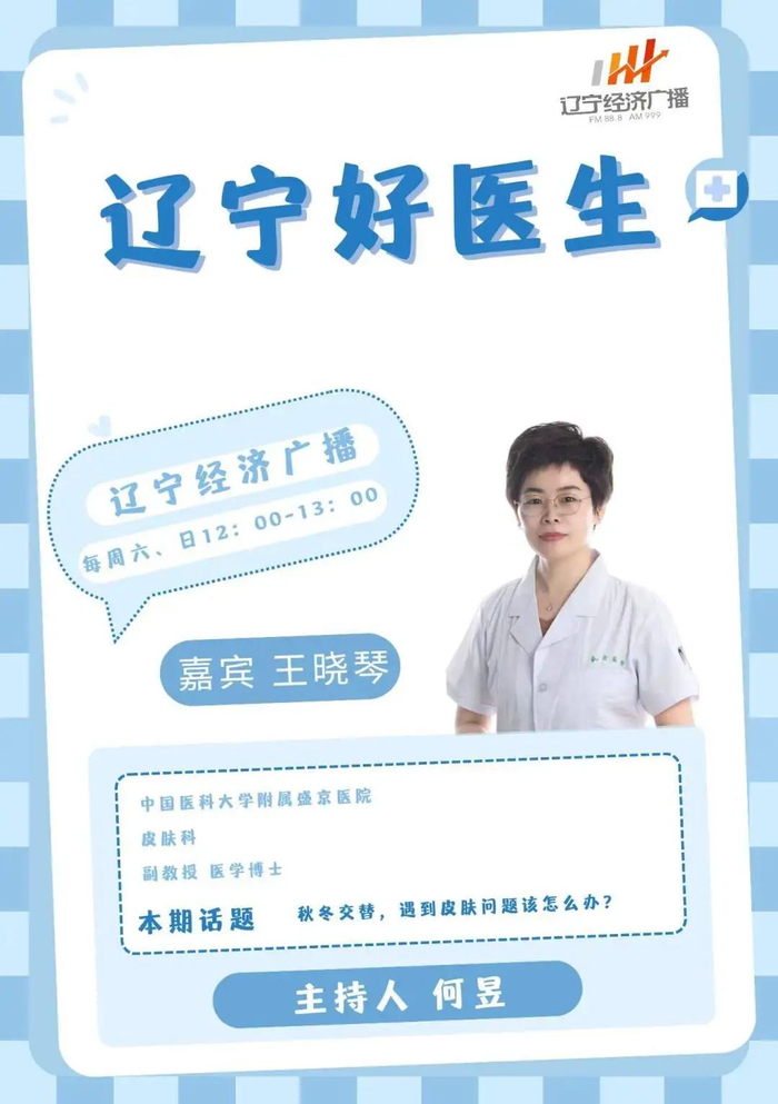 2024年9月22日(周日)中午12:00,FM88.8辽宁广播电视台经济广播《辽宁好医生》节目将邀请:中国医科大学附属盛京医院皮肤科主任,主任医师吴严医生;皮肤科副教授,副主任医师王晓琴医生;皮肤科主治医师,美容主诊医师慕珍珍医生走进直播间,和您聊聊:秋冬交替,遇到皮肤问题该怎么办?欢迎大家收听收看。