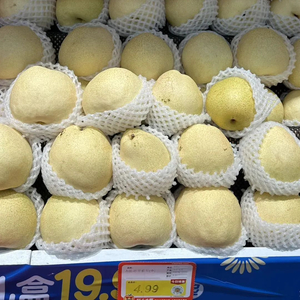 某生鲜商超里,冰糖秋月梨礼盒装79.9元一箱(3.25公斤)。能看到许多人的购物车里都放了一箱,正在拿货的配送小哥说,这是最近的热卖款。