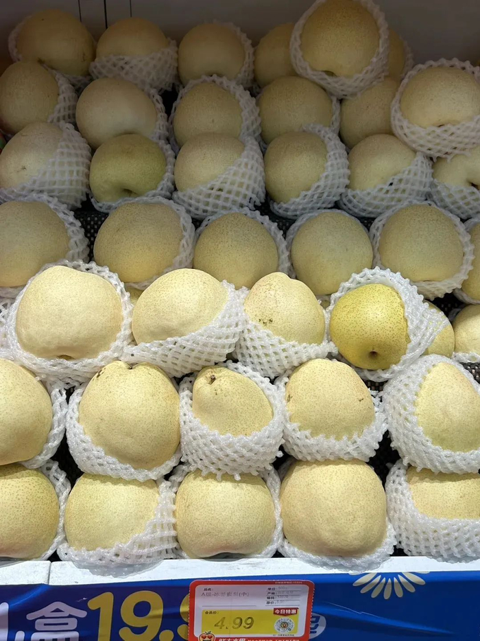 杭州萧山大型商超、连锁水果店,还有一些头部电商卖的秋月梨,大多来自这些地方,比如盒马秋月梨的产地是烟台,大润发超市里卖的是从莱阳核心产区直采的冰糖秋月梨,标价9.98元/斤。