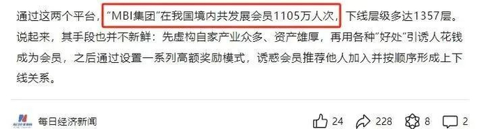 根据每日经济新闻公开信息显示,MBI集团在我国境内累计发展会员达到1105万人次,其下线层级高达1357层,会员人数累计3万多人。