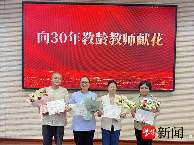 杏坛育人三十载,不忘初心铸芳华。四位从教三十年的优秀教师:夏静老师、马天怡老师、徐志刚老师、陆莉萍老师上台领取荣誉证书,青年教师向他们献上鲜花。三十年的斗转星移,他们默默谱写着岁月的春华秋实,用辛勤付出培育桃李满园。