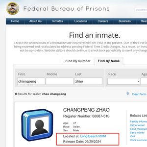 记者在美国联邦监狱局(Bureau of Prisons)官网得知,赵长鹏当前的位置更新为位于加利福尼亚州中部的长滩居住地重返社会管理局(Residential Reentry Management,RRM)。这意味着他正接受重返社会前的准备和评估。如果一切正常,他将在9月29日重返社会。