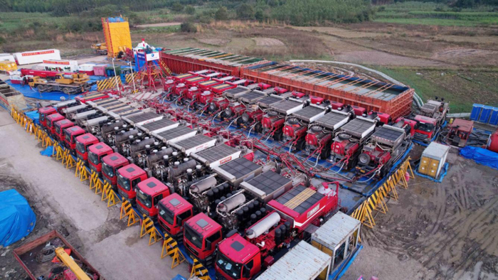 “我们采用差异化工程工艺,将高压水、支撑剂和化学品的混合液体注入页岩层中,使其在水压下破裂,产生多条裂缝,如同将纳米级的‘羊肠小道’扩建成宽敞的‘高速公路’,让页岩里的天然气沿通畅的采气通道跑到水平井段,一路到达地面,”陆文师形象地介绍,“项目全部采用国产化核心装备和关键技术,有效助力高水平科技自立自强。”