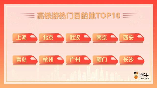 高铁作为一种便捷高效的交通工具,其在旅游大交通中发挥的作用也愈发显著,越来越多的用户选择乘坐高铁前往目的地,再在目的地参加当地跟团游或租车自驾。《报告》数据显示,自9月17日发售国庆假期首日高铁票以来,京沪高铁、沪宁城际高铁、沪杭高铁、京广高铁等线路的预订热度尤为火爆,其中,上海、北京、武汉、南京、西安、青岛、杭州、广州、厦门、长沙是途牛用户高铁游的热门选择。