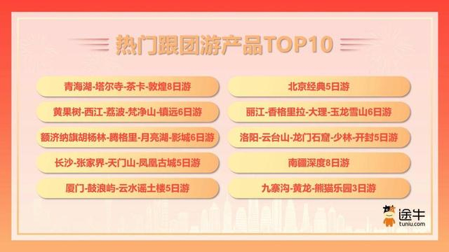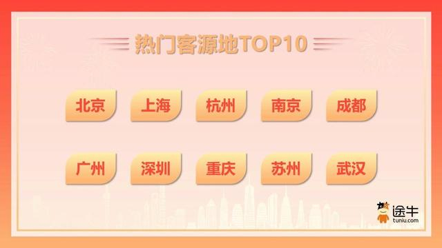 《报告》数据显示,北京、上海、杭州、南京、成都、广州、深圳、重庆、苏州、武汉等地用户预订热度位列途牛“国庆出游热门客源地TOP”榜单前列。此外,海口、乌鲁木齐、呼和浩特、宜昌、银川等三线城市用户的出游热度也实现了显著增长。
