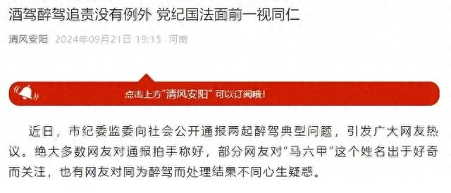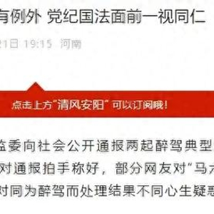 近日,安阳市纪委监委向社会公开通报两起醉驾典型问题,引发广大网友热议。绝大多数网友对通报拍手称好,部分网友对“马六甲”这个姓名出于好奇而关注,也有网友对同为醉驾而处理结果不同心生疑惑。